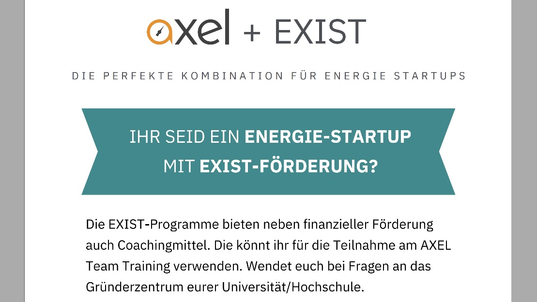 Seid Ihr ein Team, das Energiedienstleistungen oder -produkte anbieten möchte? Dann sichert euch die Förderung durch EXIST für das AXEL Team Training!