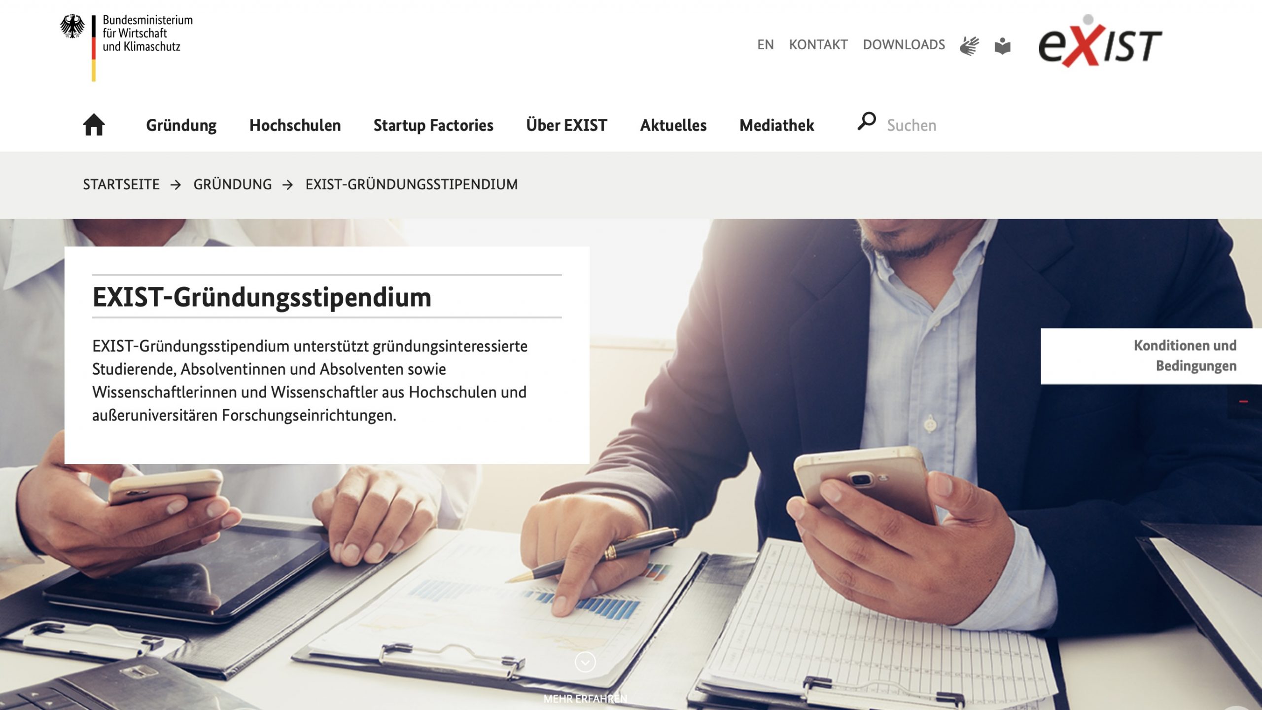 EXIST-Gründungsstipendium unterstützt gründungsinteressierte Studierende, Absolvent/Innen sowie Wissenschaftler/Innen aus Hochschulen und außeruniversitären Forschungseinrichtungen, um sich mit Unterstützung ihrer Hochschule oder Forschungseinrichtung auf ihre Unternehmensgründung vorzubereiten. Wichtigste Voraussetzung ist, dass es sich bei der geplanten Geschäftsidee um ein innovatives, technologieorientiertes oder wissensbasiertes Produkt mit signifikanten Alleinstellungsmerkmalen und guten wirtschaftlichen Erfolgsaussichten handelt. Auch Dienstleistungen werden unter diesen Voraussetzungen gefördert.
