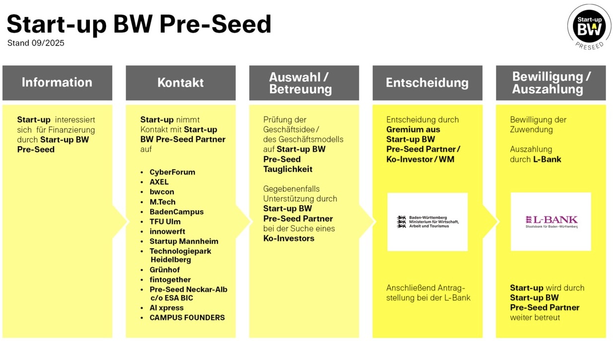 Viele innovative Geschäftsideen werden nie realisiert, weil vielen Gründerinnen und Gründern, insbesondere in der frühen Gründungsphase, die nötige Finanzierung fehlt. Aus diesem Grund wurde das Finanzierungsinstrument „Start-up BW Pre-Seed“ geschaffen. Start-up BW Pre-Seed ist ein Förderinstrument, das in einer frühen Phase ansetzt. In dieser Phase agieren institutionelle Anleger aufgrund des erhöhten Risikos und der ungewissen Aussicht auf die Erfolgsaussichten des Gründungsvorhabens zurückhaltend. Neben der finanziellen Unterstützung durch das Land Baden-Württemberg werden die durch Start-up BW Pre-Seed geförderten Start-ups bei der Arbeit an ihren Geschäftsmodellen und beim Aufbau ihrer Unternehmen durch die Start-up BW Pre-Seed Partner betreut. Die Partner unterstützen nicht nur bei der inhaltlichen Arbeit sondern auch bei der Suche nach Co-Investoren.